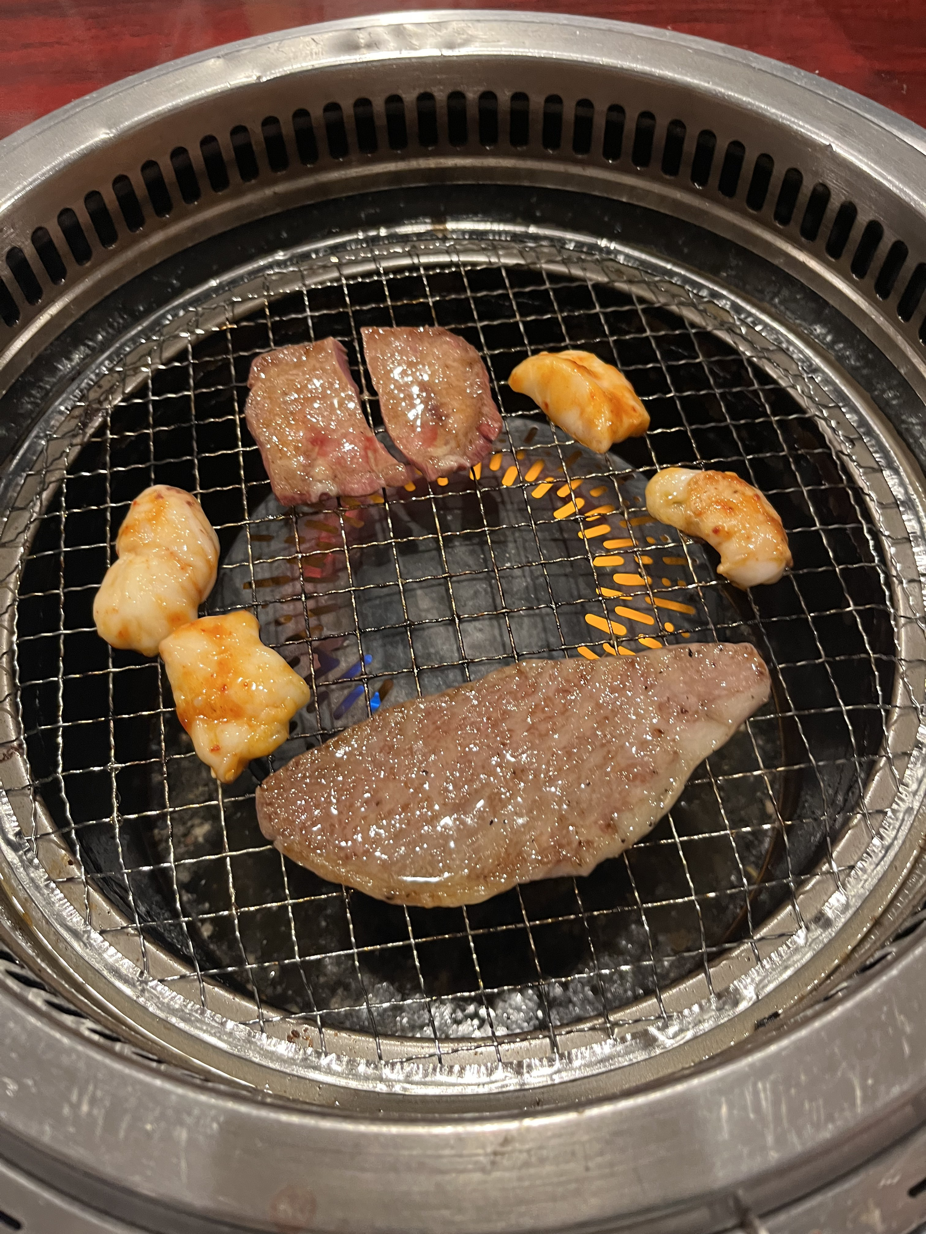 <불판에 올라간 영롱한 야끼니쿠> 허겁지겁 먹다가 정신차리고 찍은거라 설명이 빠졌지만, 저 누런건 '호르몬'(내장)입니다.