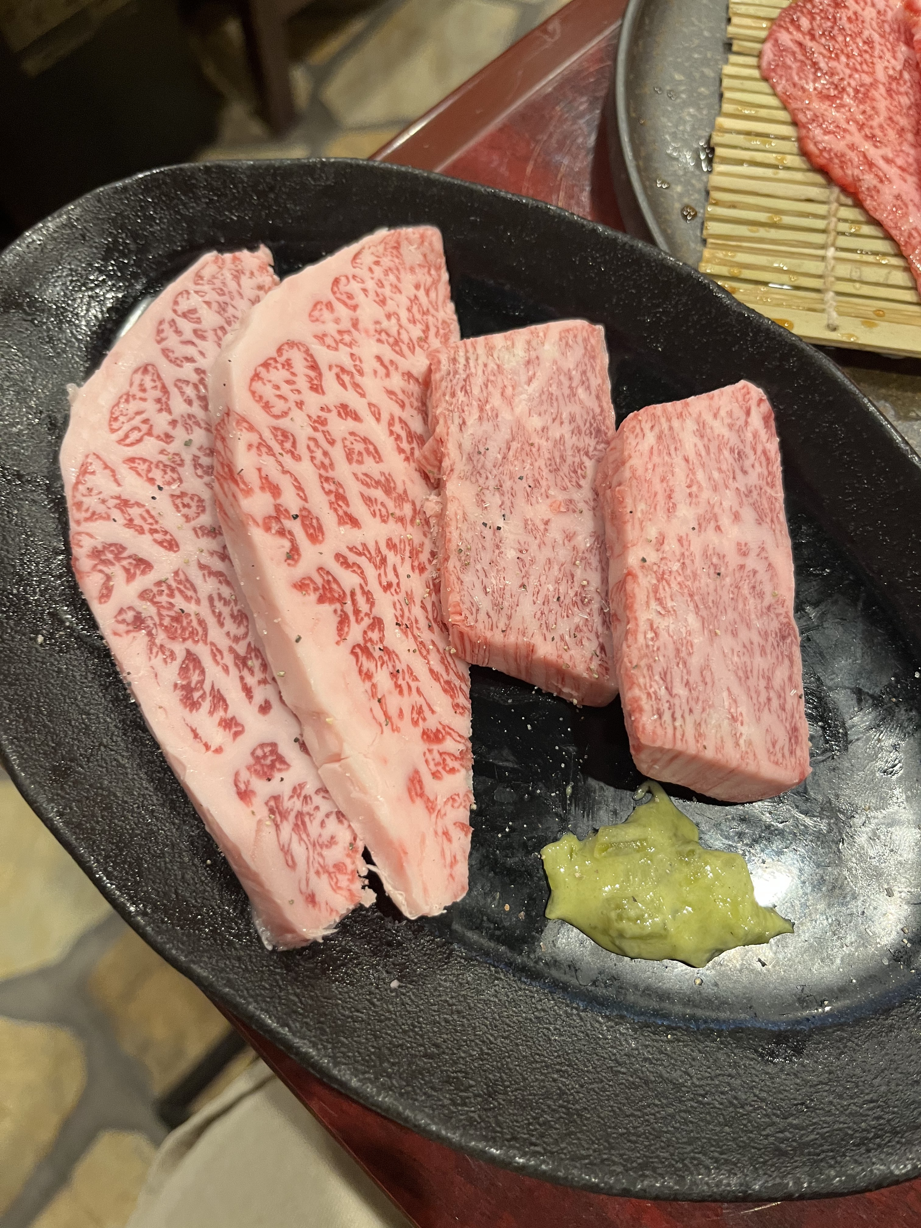 <살치살과 특상 갈비 반반> 갈비는 너무 맛있어서 반반으로 주문했어요. 그리고 누리끼리(?)한건 가게 특제 와사비 소스입니다.