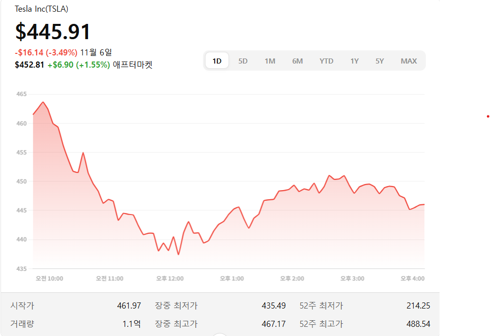 - 실시간 주가 스냅샷: 금융 데이터(예: finance API). 현재가(스냅샷): $445.91 (2025-11-07).